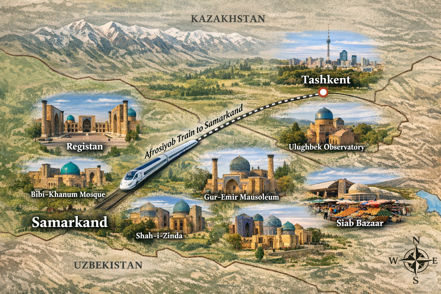 Enjoy a full-day private tour to Samarkand from Tashkent! Travel on the high-speed Afrosiyob train (or Sharq train / comfortable A/C car if Afrosiyob tickets are unavailable). Your local guide in Samarkand will meet you in the city to explore top attractions: Registan Square, Gur-Emir Mausoleum, Bibi Khanum Mosque, Shah-i-Zinda Complex, Ulughbek Observatory, and the bustling Siab Bazaar. An authentic Uzbek lunch is included.