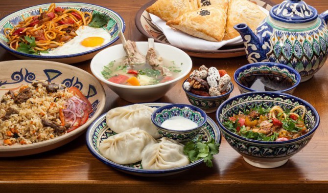 Lunch at the national Samarkand restaurant "Karimbek". Where you can taste the national Samarkand dish. The design uses a live texture of adobe and natural wood, juicy folklore motifs: national ceramics, fabrics and handmade embroidery.