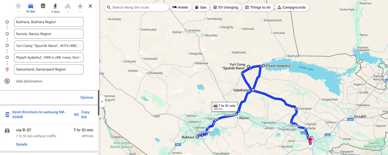 After breakfast, we will depart from the Yurt Camp and head towards Aydarkul Lake, located in the heart of the desert. Here, you can enjoy swimming, hiking, or simply relax by the tranquil waters of the lake. After spending time at the lake, we will continue our journey towards Samarkand. Along the way, we will enjoy the beautiful landscapes and take in the peaceful surroundings of the desert. We will arrive in Samarkand by the evening, where the tour will come to an end, leaving you with unforgettable memories of the desert adventure.