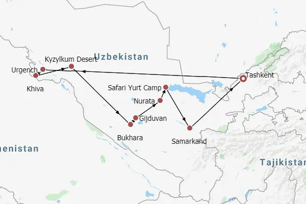 Route: Tashkent–Khiva–Bukhara–Samarkand–Tashkent